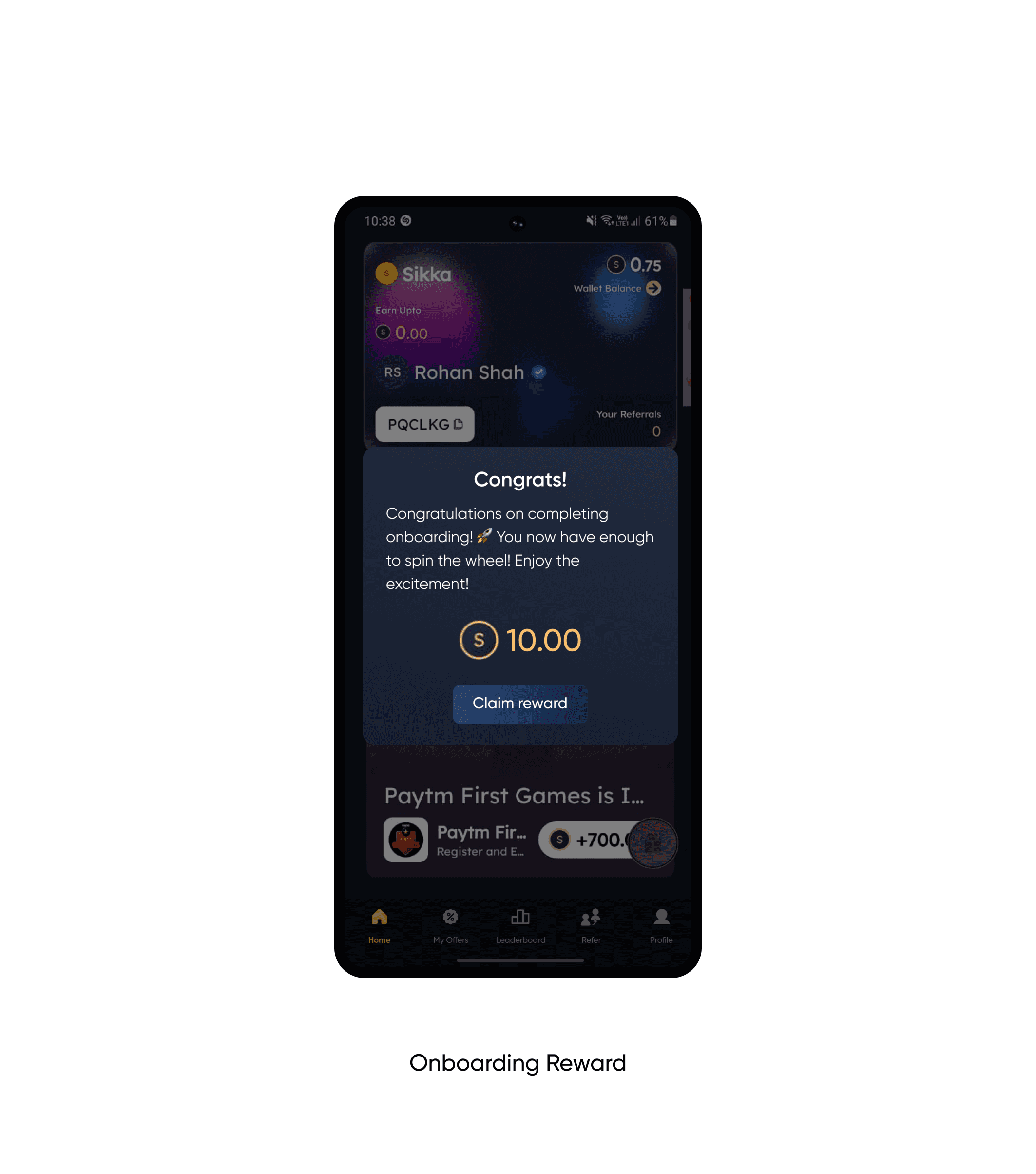 The solution to the absence of an onboarding reward has been seamlessly addressed by introducing a generous reward of 10 Sikka points for users during their onboarding experience. This not only creates a positive and rewarding introduction to the Sikka app but also strategically aligns with the cost of spinning the wheel.
